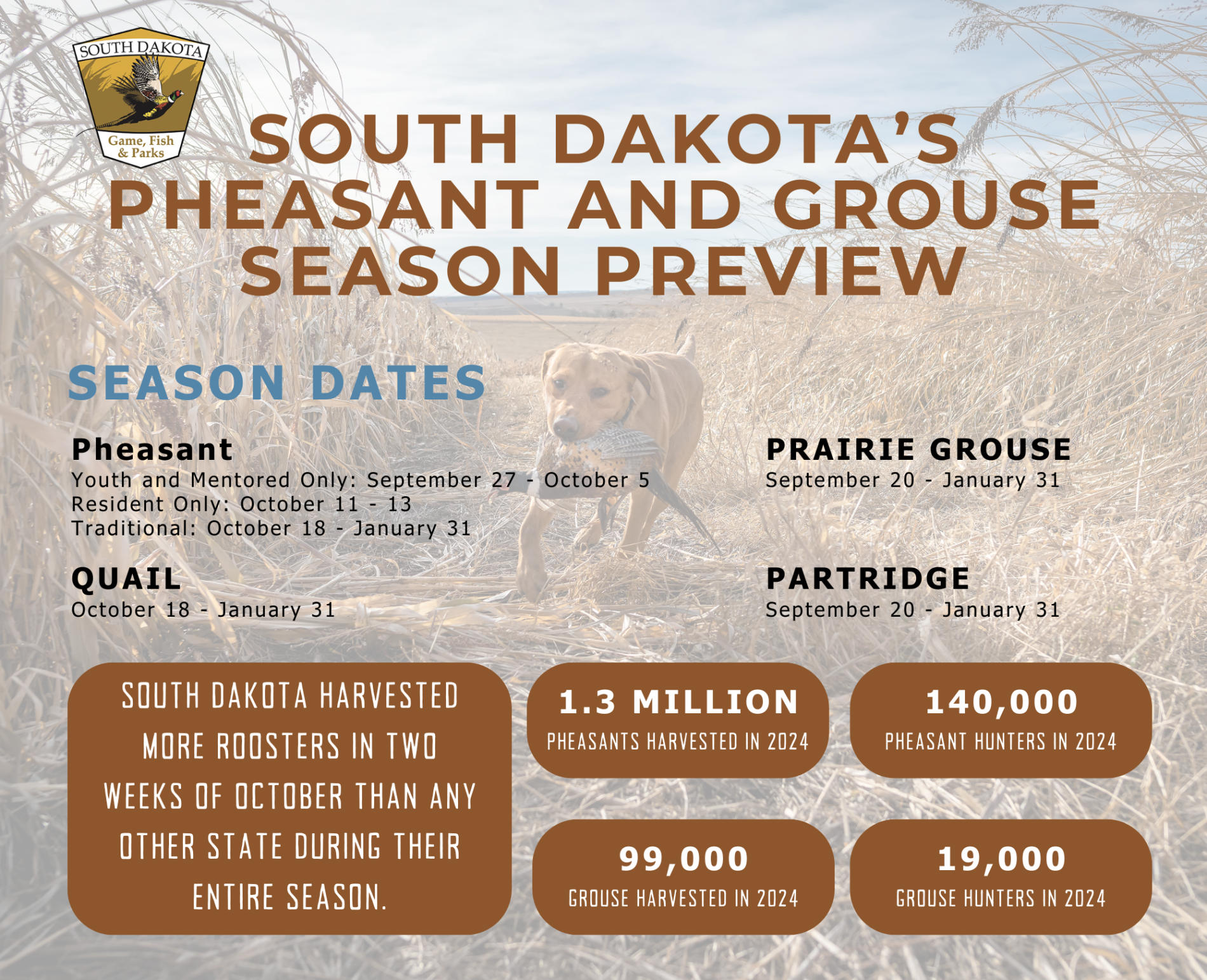 South Dakota Game, Fish, and Parks (SDGFP) report that over 1.3 million pheasants were harvested by 140,000 hunters last year in South Dakota, not including birds released on any licensed shooting preserves. 99,000 grouse were harvested by 19,000 hunters, the highest harvest number on record in a quarter century. In 2024, South Dakota harvested more roosters in two weeks of October than any other state during their entire season. This 2025 season is expected to be just as plentiful, if not a little more so.